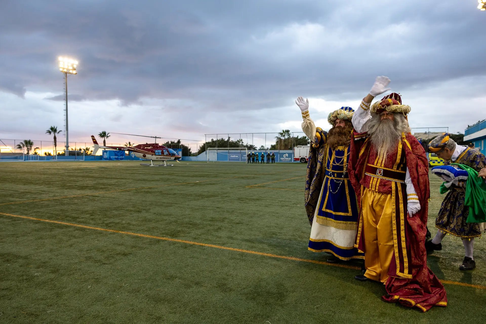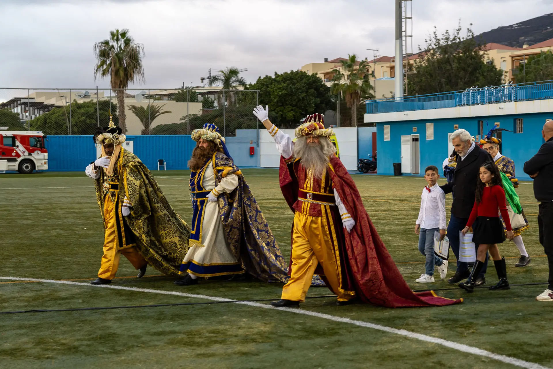 5. Januar 2026. – Ihre Majestäten, die Heiligen Drei Könige des Ostens, kamen heute per Hubschrauber in Adeje an und landeten auf dem städtischen Fußballplatz vor mehreren hundert Kindern und Familien. Obwohl die Wettervorhersage mit Unwetter drohte, fand die Ankunft Ihrer Majestäten mit nur wenigen Regentropfen statt. Bei ihrer Ankunft wurden sie vom Bürgermeister von Adeje begrüßt, der ihnen den magischen Schlüssel der Stadt überreichte, mit dem sie alle Häuser betreten und ihre Geschenke in der am sehnlichsten erwarteten Nacht des Jahres überbringen konnten.