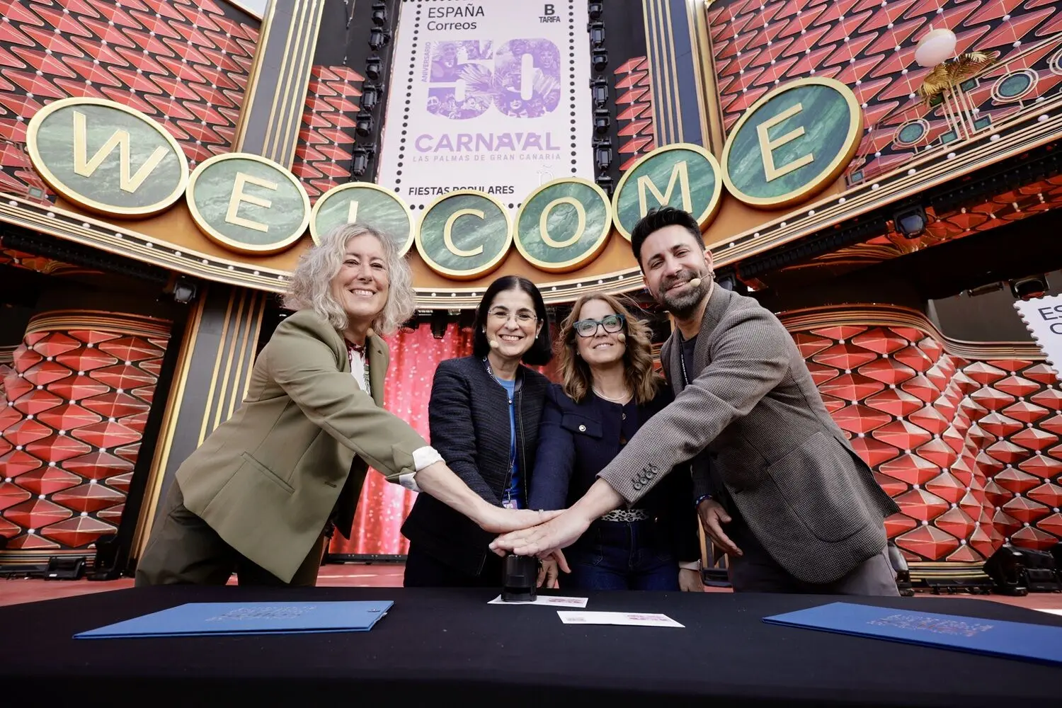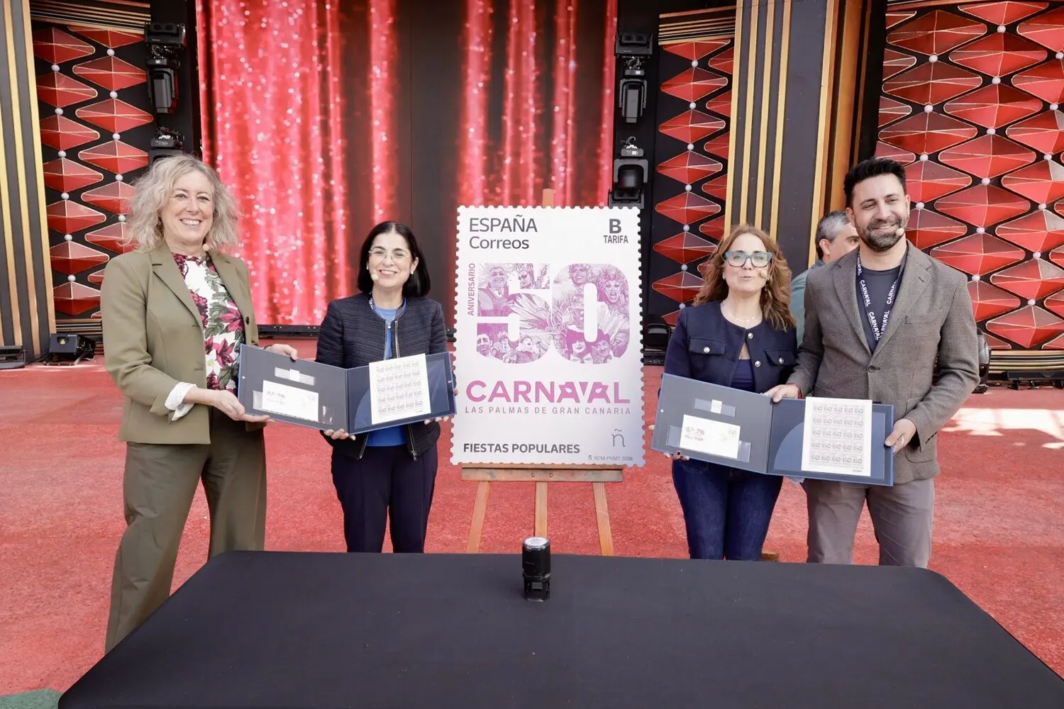 - Die Bürgermeisterin Carolina Darias präsentiert auf der Bühne von „Las Vegas” diese Hommage der spanischen Philatelie an die Karnevalsfeierlichkeiten der Hauptstadt zu ihrem fünfzigjährigen Jubiläum.