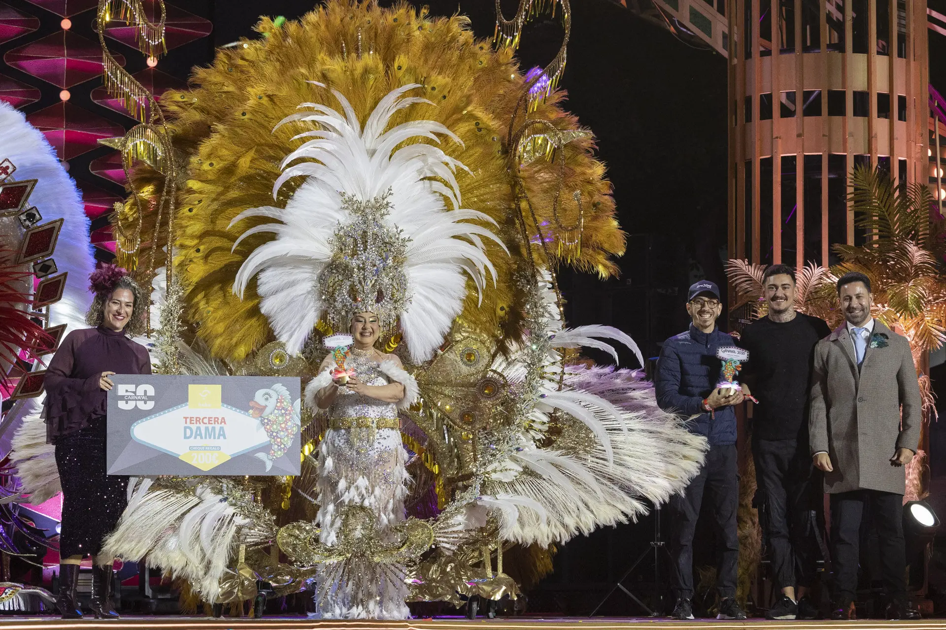 Die Auszeichnung als dritte Ehrendame der Grande Dame des Karnevals ging an die Kandidatin der Asociación Cultural La Mayordomía de Tamaraceite, Ángela del Rosario Tavío Medina, die mit einem Entwurf von Aythami Rodríguez und Omar Rodríguez mit dem Titel „Renacer“ (Wiedergeburt) auf die Bühne kam. Die vierte Ehrendame bis zur nächsten Ausgabe des Festes ist Sonia Acosta Díaz, Vertreterin des Bezirks Tamaraceite-San Lorenzo-Tenoya, die das von Julio Vicente Artiles entworfene Kostüm „Eterna“ trug. Alle erhalten außerdem einen Geschenkgutschein im Wert von 200 Euro, gesponsert von Hebe, Centro de Envejecimiento Activo.