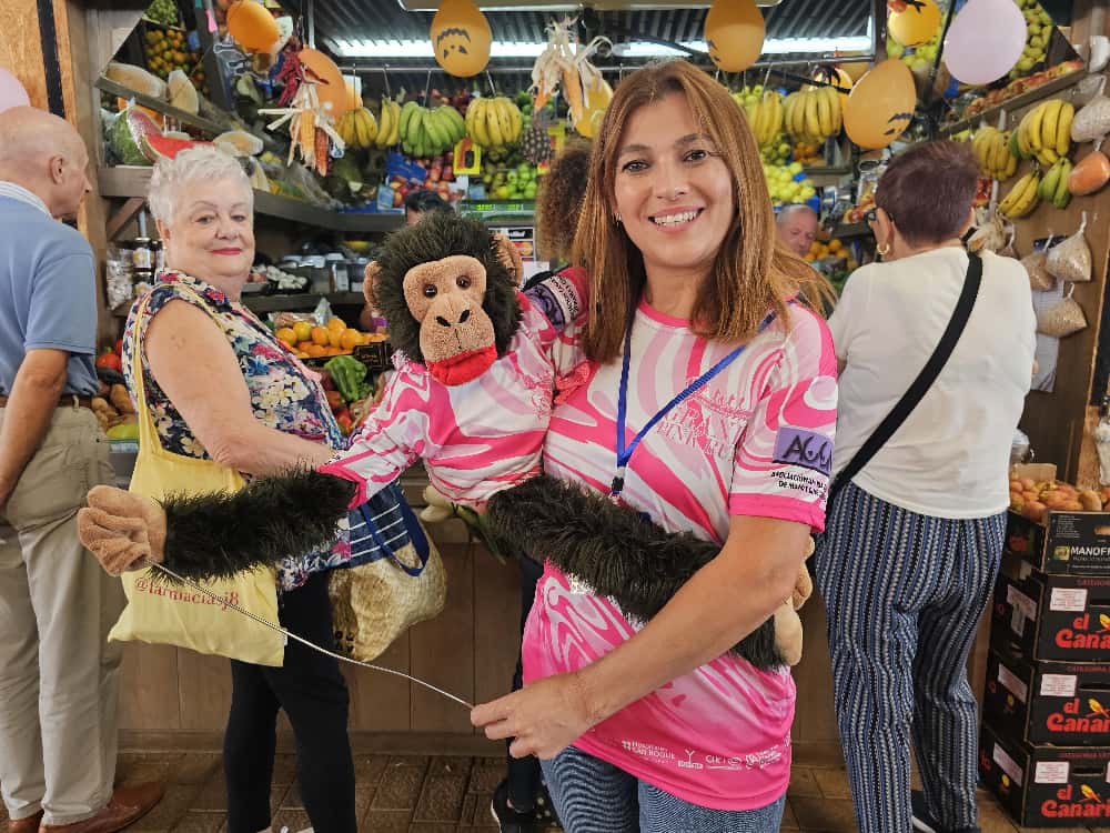 Luftballons und andere Dekorationen in der repräsentativen Farbe schmückten jeden Raum des Marktes, und auch die Standbetreiber trugen das entsprechende Band. Die beiden Freiwilligen von ACCMyG begrüßten die Kunden beim Betreten des Marktes mit einem Lächeln, Informationen und Aufklebern als Zeichen des Dankes an diejenigen, die sich finanziell an der Aktion beteiligen wollten. Zu ihnen gesellte sich Momo, das offizielle Maskottchen der Organisation, das als Mitglied der Organisation ebenfalls sein T-Shirt trug und der schon so viele Frauen gesehen hat, die gegen die Krankheit gekämpft und sie überwunden haben – oder auch nicht.