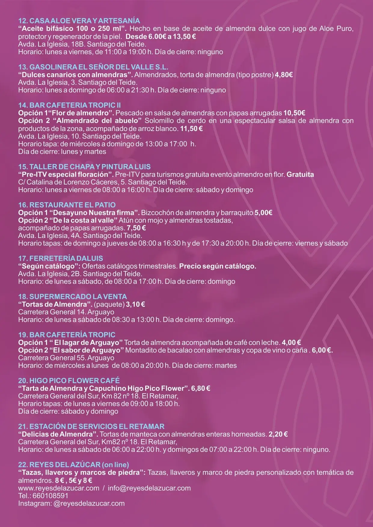 Was die Angebote im Einzelhandel betrifft, so nehmen in diesem Jahr teil: Supermarkt El Valle, Blumenladen El Valle, Karosserie- und Lackierwerkstatt Luis; Mini Market Santiago del Teide; Tienda Mirely; Ferretería DaLuis; Lava de Canarias; Casa Aloe Vera y Artesanía; Supermercado La Venta; Estación de Servicios El Retamar; Gasolinera El Señor del Valle und Reyes del Azúcar (Online-Shop). [Ayto. Santiago del Teide]