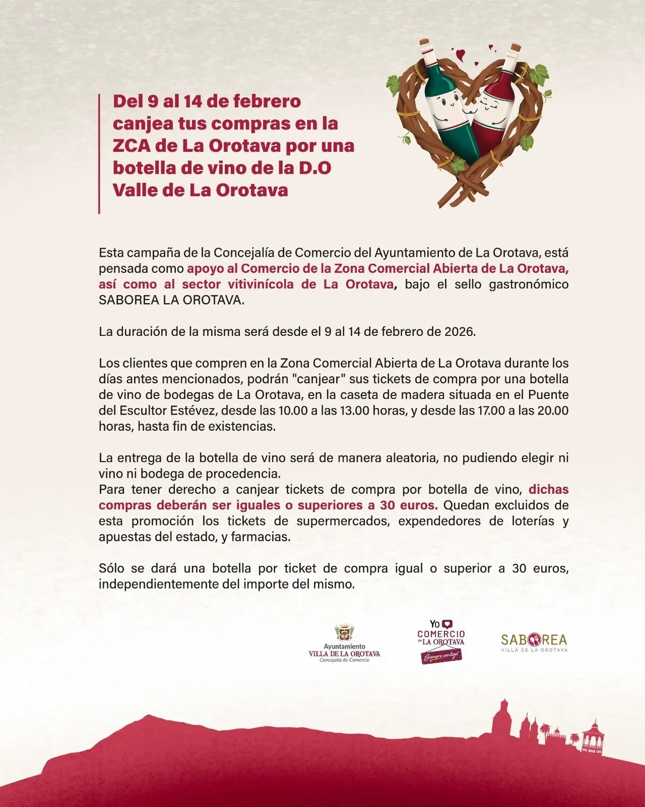 Die zuständige Stadträtin Deisy Ramos erklärt, dass Kunden, die vom 9. bis 14. Februar in der ZCA einkaufen, ihre Kassenzettel gegen eine Flasche Wein der D.O. Valle de La Orotava eintauschen können, wenn sie einen Kaufbeleg über mindestens 30 Euro vorlegen. Der Umtauschort ist der Holzstand, der sich an der Brücke Puente de la Carrera Escultor Estévez befindet und morgens von 10:00 bis 13:00 Uhr und nachmittags von 17:00 bis 20:00 Uhr geöffnet ist (solange der Vorrat reicht). Pro Kaufbeleg wird eine Flasche nach dem Zufallsprinzip ausgegeben, ohne dass die Möglichkeit besteht, ein bestimmtes Weingut oder eine bestimmte Sorte auszuwählen.