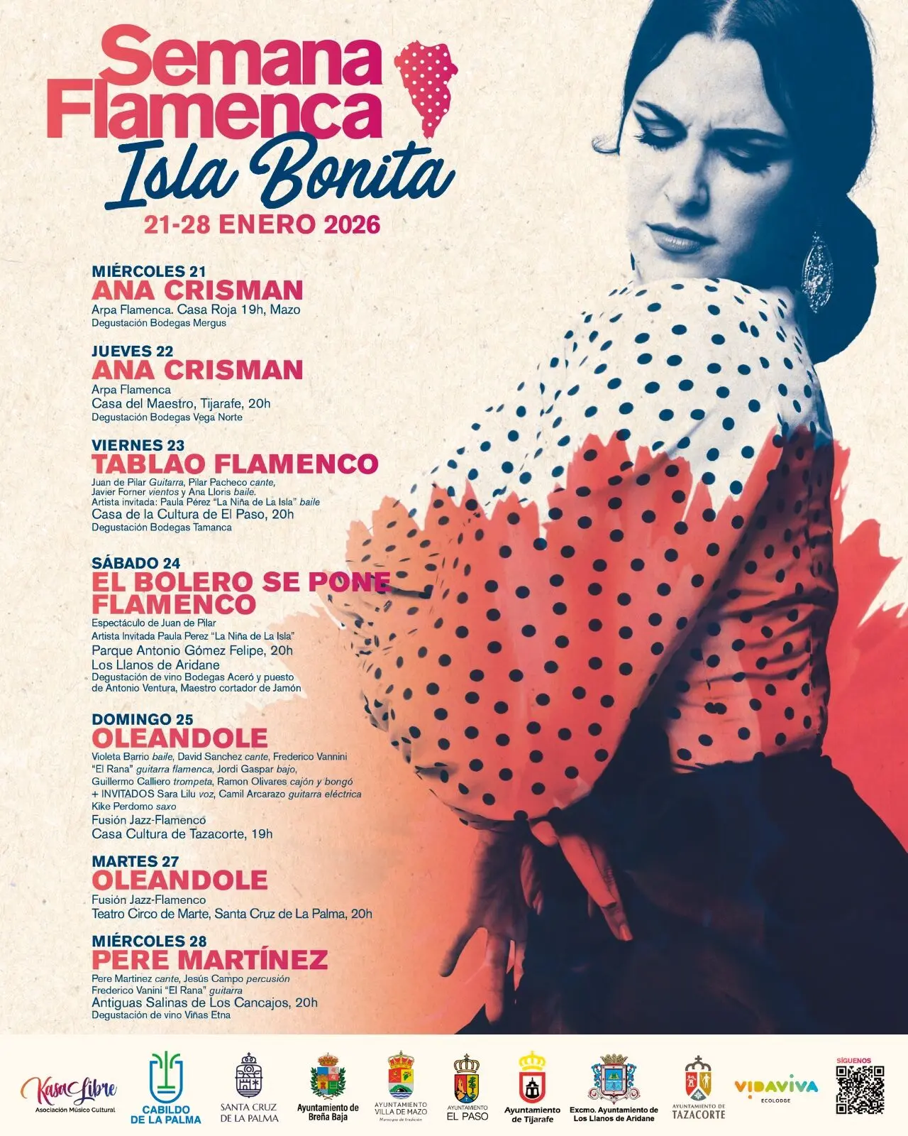 Die Semana Flamenca Isla Bonita ist ein Projekt, das von der Asociación Músico Cultural Kasa Libre in Zusammenarbeit mit dem Unternehmen VidaViva organisiert wird. Dieses Festival wird dank der Unterstützung des Kulturministeriums der Inselregierung von La Palma und der Kulturämter der Gemeinden Villa de Mazo, Tijarafe, El Paso, Los Llanos de Aridane, Tazacorte, Santa Cruz de La Palma und Breña Baja veranstaltet. [Cabildo La Palma]