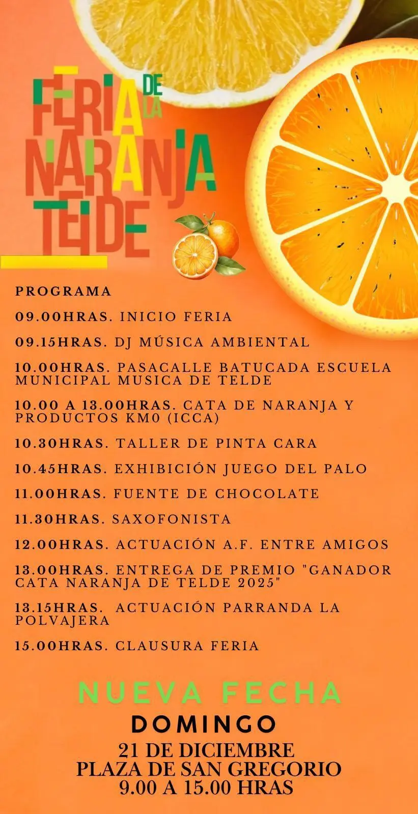 Telde, 3. Dezember 2025. – Auf der Plaza de San Gregorio findet am Sonntag, dem 21. Dezember, zwischen 9:00 und 15:00 Uhr die Orangenmesse 2025 statt, die wegen des Durchzugs des Sturms Emilia über die Kanarischen Inseln verschoben wurde. An diesem Tag werden sich zehn landwirtschaftliche Betriebe aus verschiedenen Teilen der Gemeinde versammeln, um den Besuchern die wichtigsten Früchte anzubieten. Außerdem wird die entsprechende Preisverleihung für die Gewinner der diesjährigen Orangenverkostung stattfinden, die von Fachleuten des Cabildo de Gran Canaria und der kanarischen Regierung bestimmt wird.